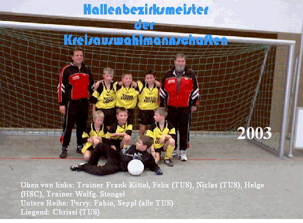 Oben: Trainer W. Stengel, Niclas, Fabio, Felix (alle TuS), Brazze (SVM), Maskottchen Trainersohn Philipp Kittel, Trainer F. KittelMitte: Seppl, Perry (beide TuS), Kevin (SGL),Unten: Chrissi (TuS)